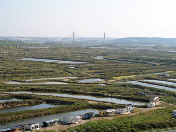 The loop returns to the coast at Castro Marim, where the salt pans that produce the Algarve’s most distinctive culinary export are visible from the road as vast white rectangles against the flat coastal plain. The Castro Marim salt pans are a nature reserve and a working salina simultaneously: the flamingos that feed in the shallow water during migration season share the pans with the workers who harvest the fleur de sel by hand. The combination of biological productivity and traditional working culture is one of the most intact in southern Europe.