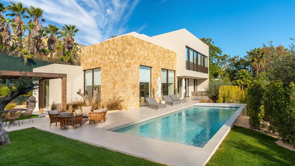 Contemporary luxury villa in Quinta do Lago, Algarve with a heated pool, rooftop jacuzzi, and stunning views. Steps from golf, beaches, and fine dining