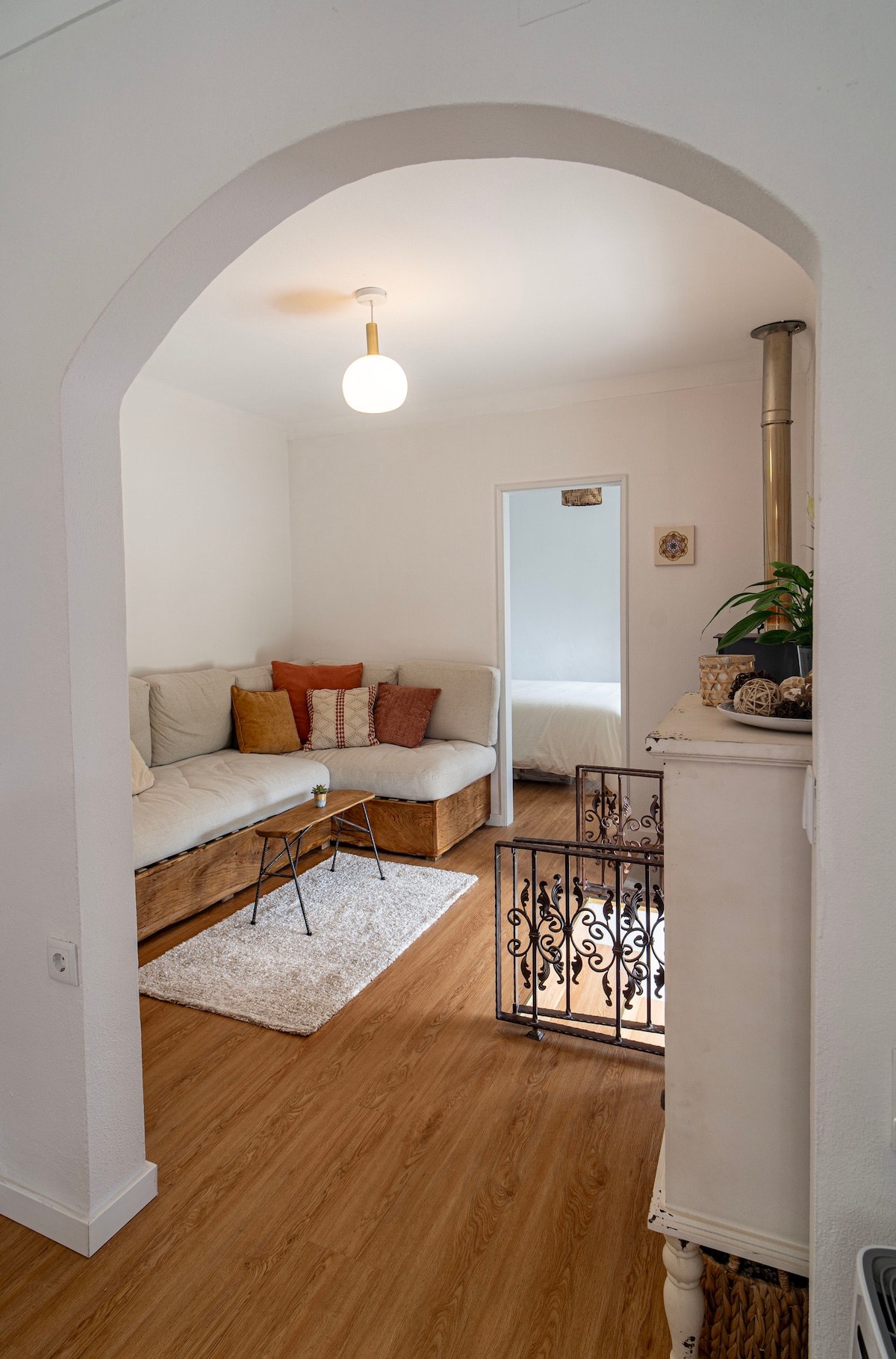 Step inside and take a few steps up into the welcoming living room, where a handmade sofa and a charming fireplace invite you to unwind.
