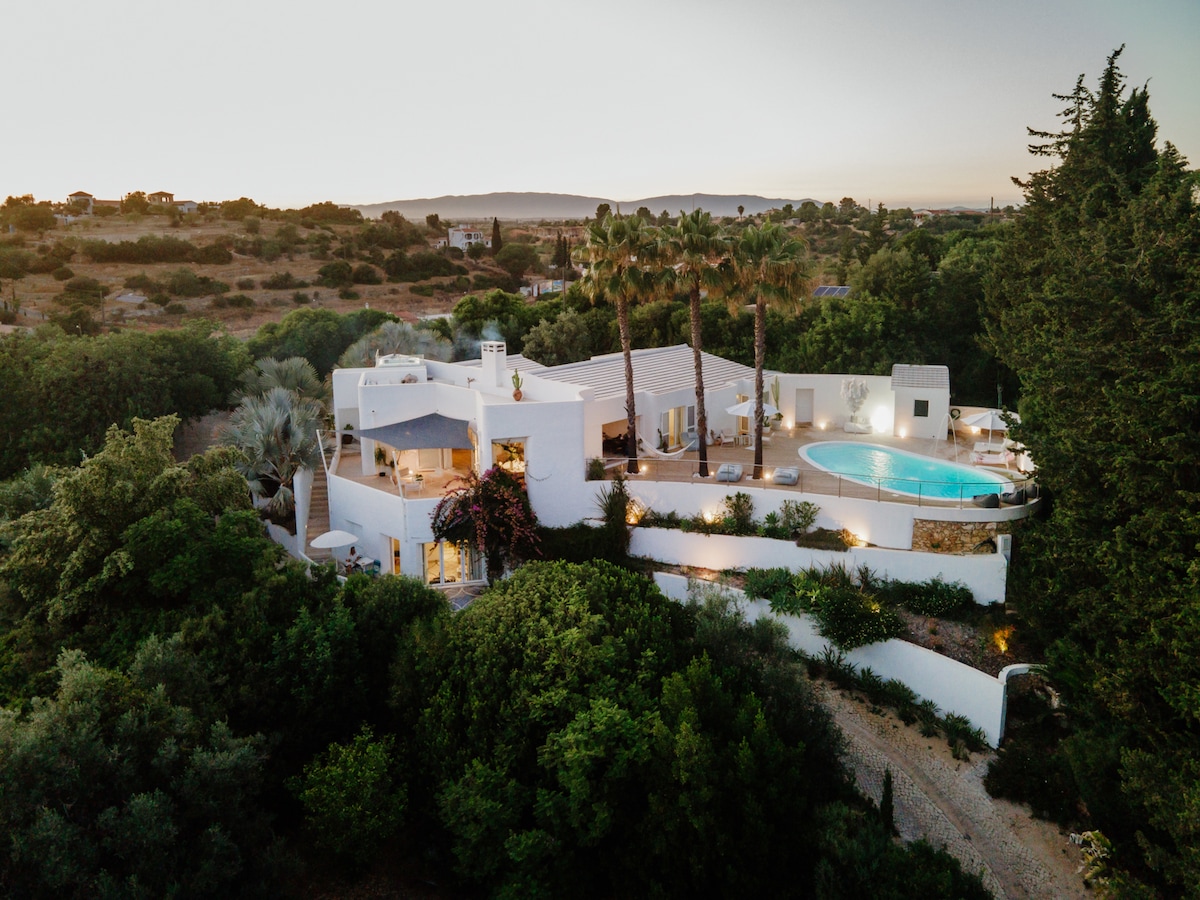 Casa dos Terraços, This beautiful villa, located on a hill near the charming fishing village of Carvoeiro, offers a contemporary modern style amid lush nature and absolute privacy. With a generous piece of private land, you can enjoy peace, views, greenery and space, while you are only a stone’s throw away from the sea and the most beautiful beaches.