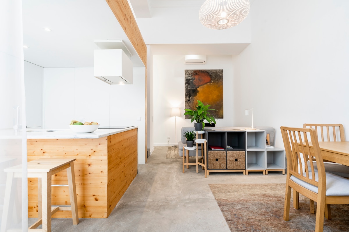 The apartment is small but as the ceiling are very high (more than 4 meters) the feeling is space. The bed is located on the mezzanine above the kitchen.