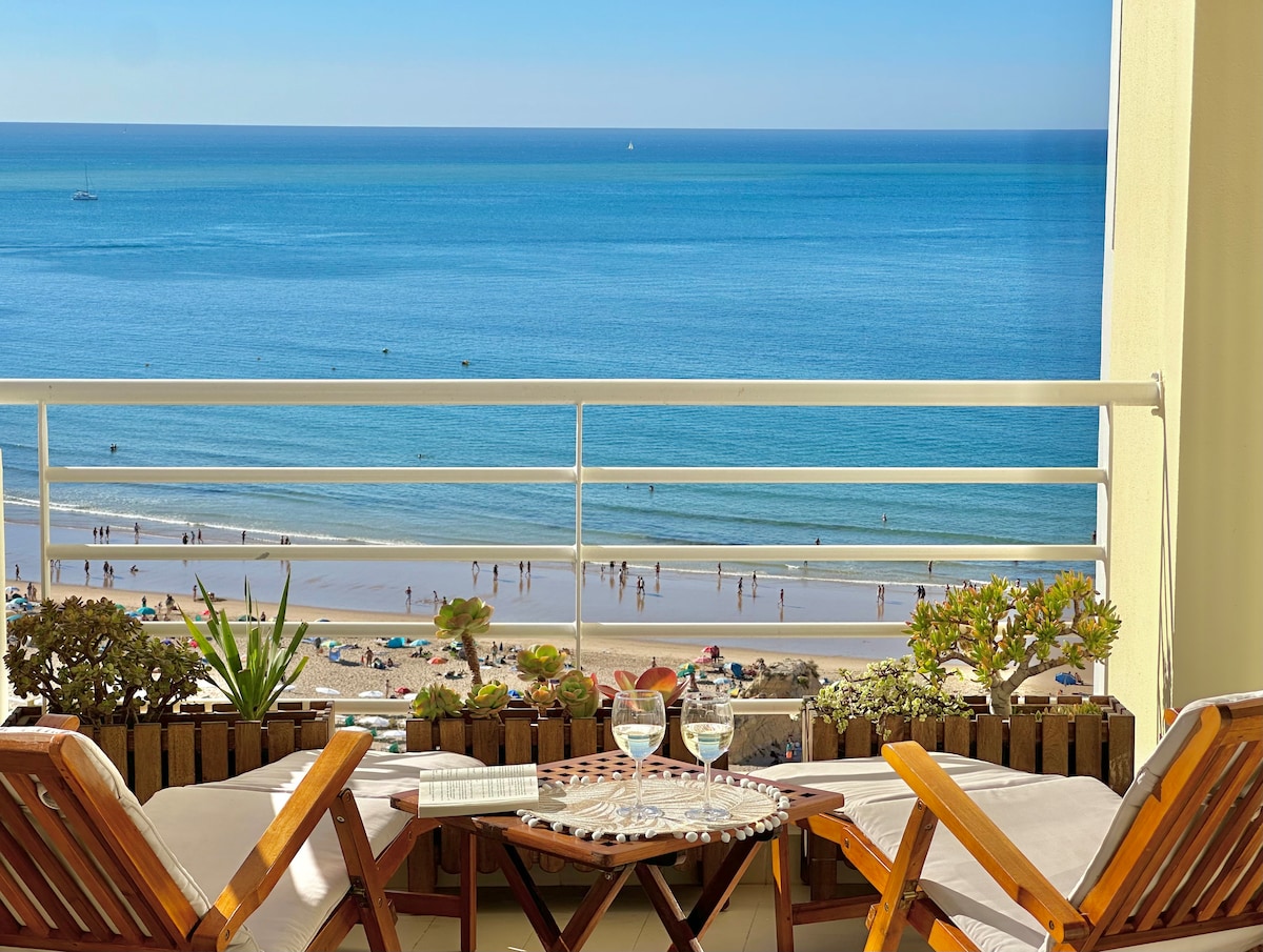 A romantic haven where holiday happiness begins. Enjoy a beachfront location with a balcony overlooking the golden sands of Praia da Rocha. Relax in an elegant king-size (160×200) premium mattress with soft linens and stay comfortable year-round with air conditioning. Exclusive garage parking included. A cozy, stylish seaside retreat for memorable moments.