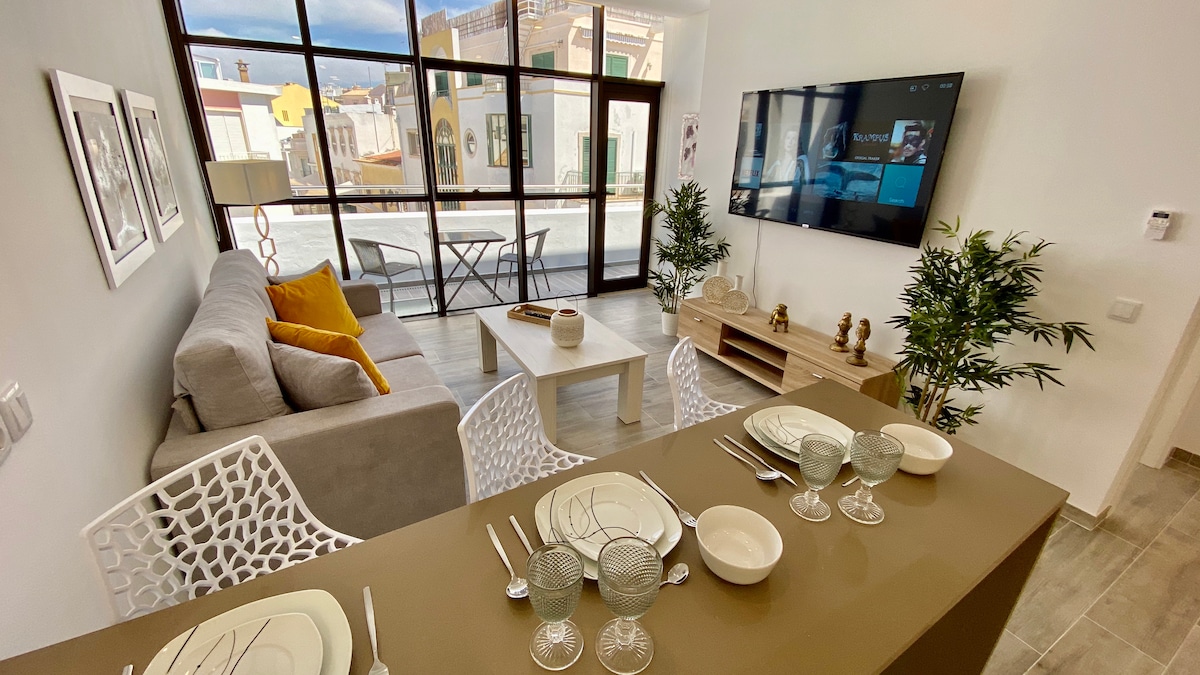 Luxurious penthouse apartment located in the absolute center of downtown Faro. In this brand new apartment, guests will be able to experience high end materials and furnishings, bright and ample areas, absolute privacy, a fully furnished balcony, a fully equipped kitchen and laundry room, and the convenience of being steps away from the marina, bars, cafes, restaurants, a supermarket and all transportation options, making this one of the most coveted apartments in Faro.