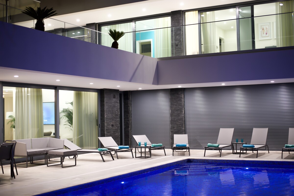 The villa has two levels and can host up to 8 guests. There are 4 ensuite bedrooms