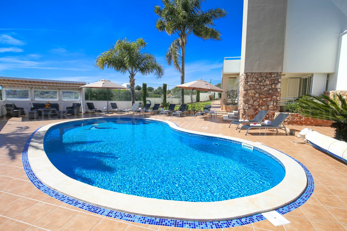 This 5 bedroom villa western Algarve has a wonderful garden, which leads to a fantastic and spacious pool (11-5m). Around the pool there are 10 sun beds, 2 parasols, 5 side tables and a lounge shaded area with a 3 seat sofa, 2 chairs with cushions and a table to fully enjoy a luxury vacation.