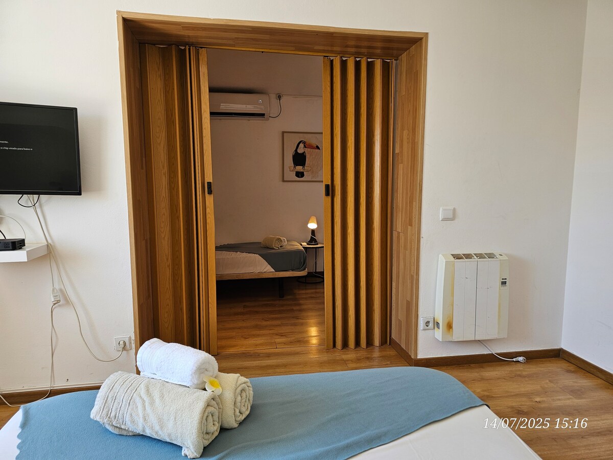 It is on the outskirts of Faro, ideal for those who have a car (and you can park your car inside the property).
