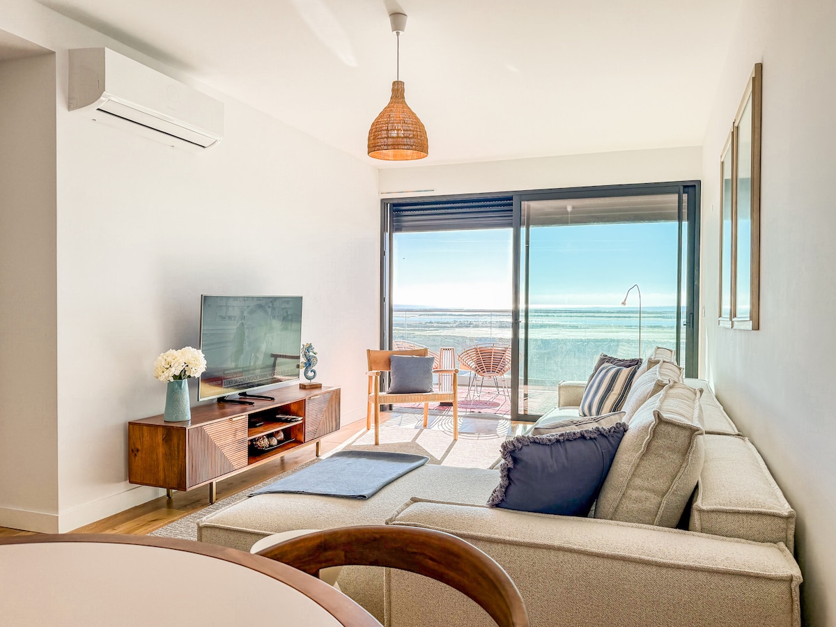 Enjoy an exclusive stay in this elegant accommodation in Fuseta, Algarve, with a 180-degree panoramic view of the Ria Formosa and access to a private swimming pool in the condominium.