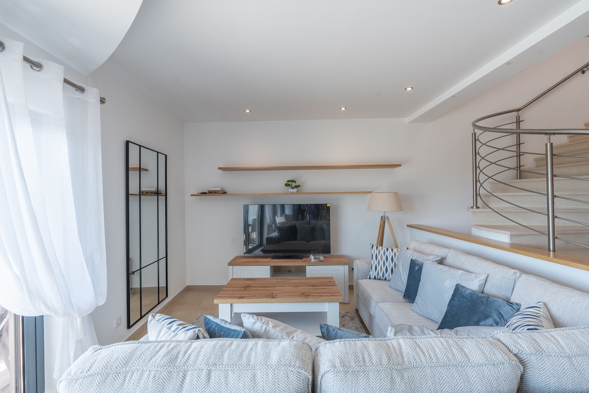 First floor: Spacious open plan living room with lounge area, 8p dining table. Fully equipped open kitchen with bar and modern appliances, one separate toilet. Balcony with 8-person dining table & lounge set, ocean view. 2nd balcony with charcoal grill next to the kitchen.