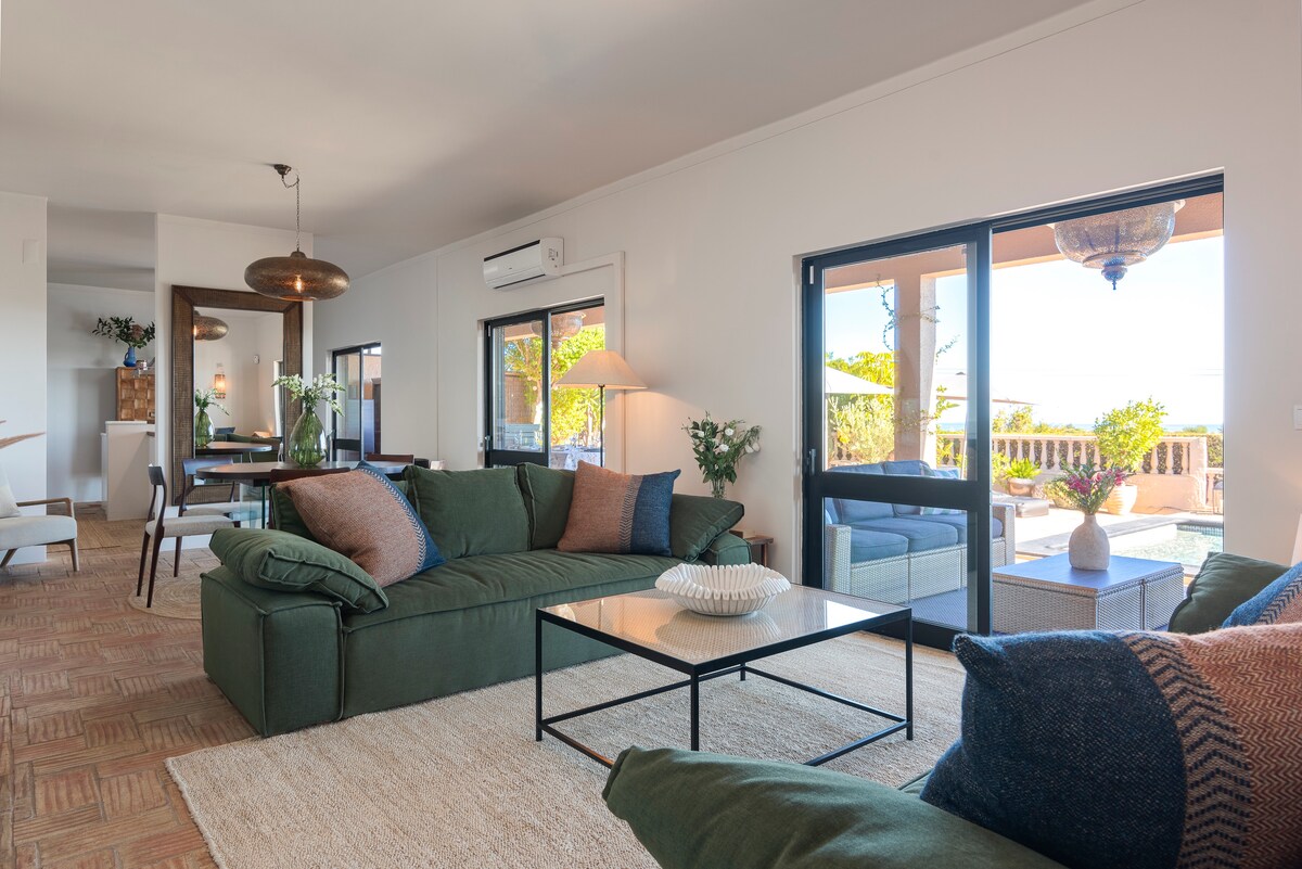 SPECTACULAR OCEAN VIEW three bedroom three bath en suite property only a five minute drive to Tavira town center. Truly, a magnificent sanctuary by the sea settled on top of the hill overlooking the beautiful expanse of orange groves and the Atlantic. Tastefully decorated with high-end furniture, made in Portugal, Bali, India and Morocco. Heated saltwater pool all year round as well as an expansive backyard with 1000 square meters of indoor outdoor space including gas Fire Pit, sauna and Jacuzzi
