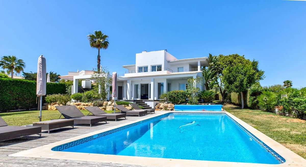 The villa is entered through gates and has a large driveway with room for several cars. The front door opens to a spacious hallway and open plan living area. The design of the house means that every room is flooded with natural light and gives an increidble feeling of space. There is a entrance Wc and a bedroom with en suite facilities. The contemporary fully fitted kitchen is complete with granite worktops and eqipped to the highest specifications. There is a TV/cinema area and comfortable seating in the lounge. From the dining area and lounge, patio doors lead to the outdoor kitchen area with Bbq, landscaped gardens and heated swimming pool (additional extra) with high quality sun loungers. There is external dining area and sofa in which to relax and enjoy the garden. From the entrance hallway, an impressive solid wood open staircase leads to a further seating area with stunning sea views, terrace and two more bedrooms both with en suite bathrooms. Within just a couple of minutes you can walk to the cliffs and enjoy the stunning walks including the Seven Hanging Valleys trail. There is a traditional Portuguese restaurant which you can walk to easily and also Carvoeiro Clube tennis.