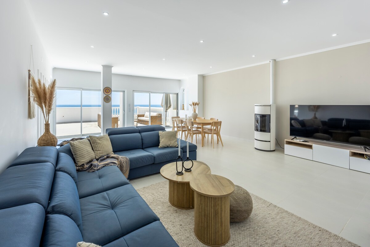 Moving up to the second floor, you will find a spacious living room and kitchen, filled with natural light. The living room is equipped with a big AC, a pellet fireplace, TV, and a dining table. From the living room, you can access a house terrace with stunning views of the sea and the town of Lagos.